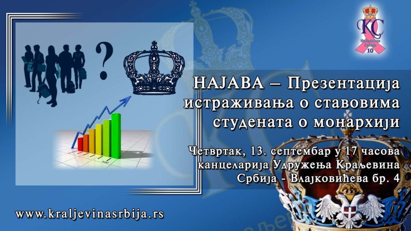 Udruženje Kraljevina Srbija vas za zadovoljstvom poziva na prezntaciju rezultata istraživanja o stavovima studenata Univerziteta u Beogradu o monarhiji, koje je u prethodnom periodu sprovela Kraljeva omladina, podmladak našeg Udruženja.